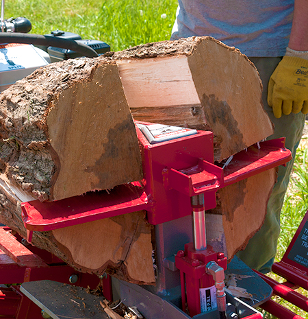 Options include a six-way wedge and table grate. They not only ease back strain but greatly increase production. The 6-way wedge significantly increases yield and the table grate holds the split logs at splitter height for stacking or convenient loading onto a conveyor. Standard 24" opening.